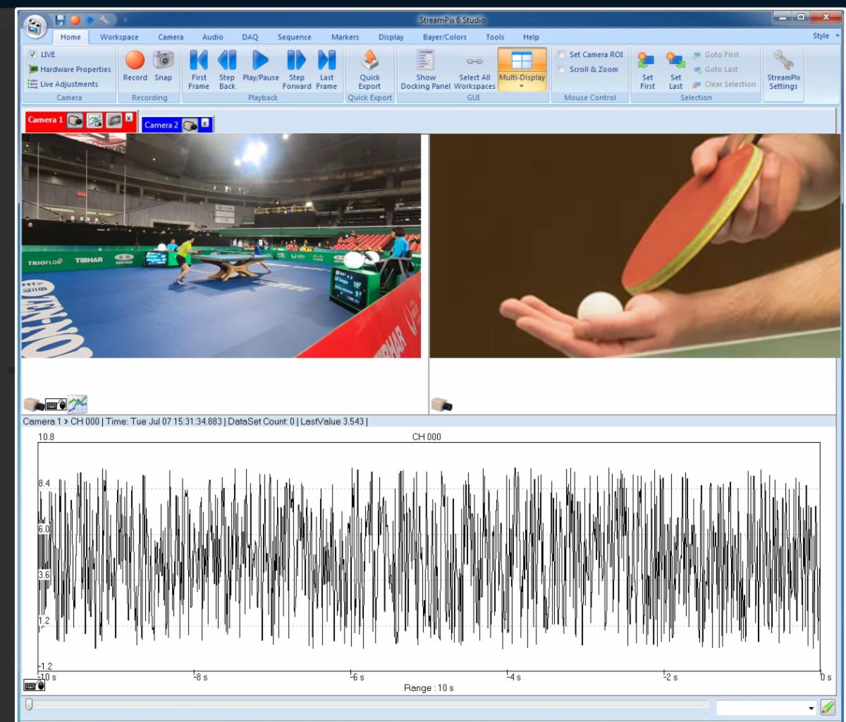 NorPix StreamPix Motion Capture records from multiple cameras, synchronized using the frame grabbers embedded in the StreamPix Recording Station. Each camera transmits images at 1080p resolution (1920 pixels wide x 1080 pixels high) at 246 frames per second. Every frame of video is captured from up to eight of these cameras for a total bandwidth of over 4,000 megabytes per second (MBps).