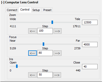 It allows you to modify Zoom, Focus and Iris via a slider or an edit box.
